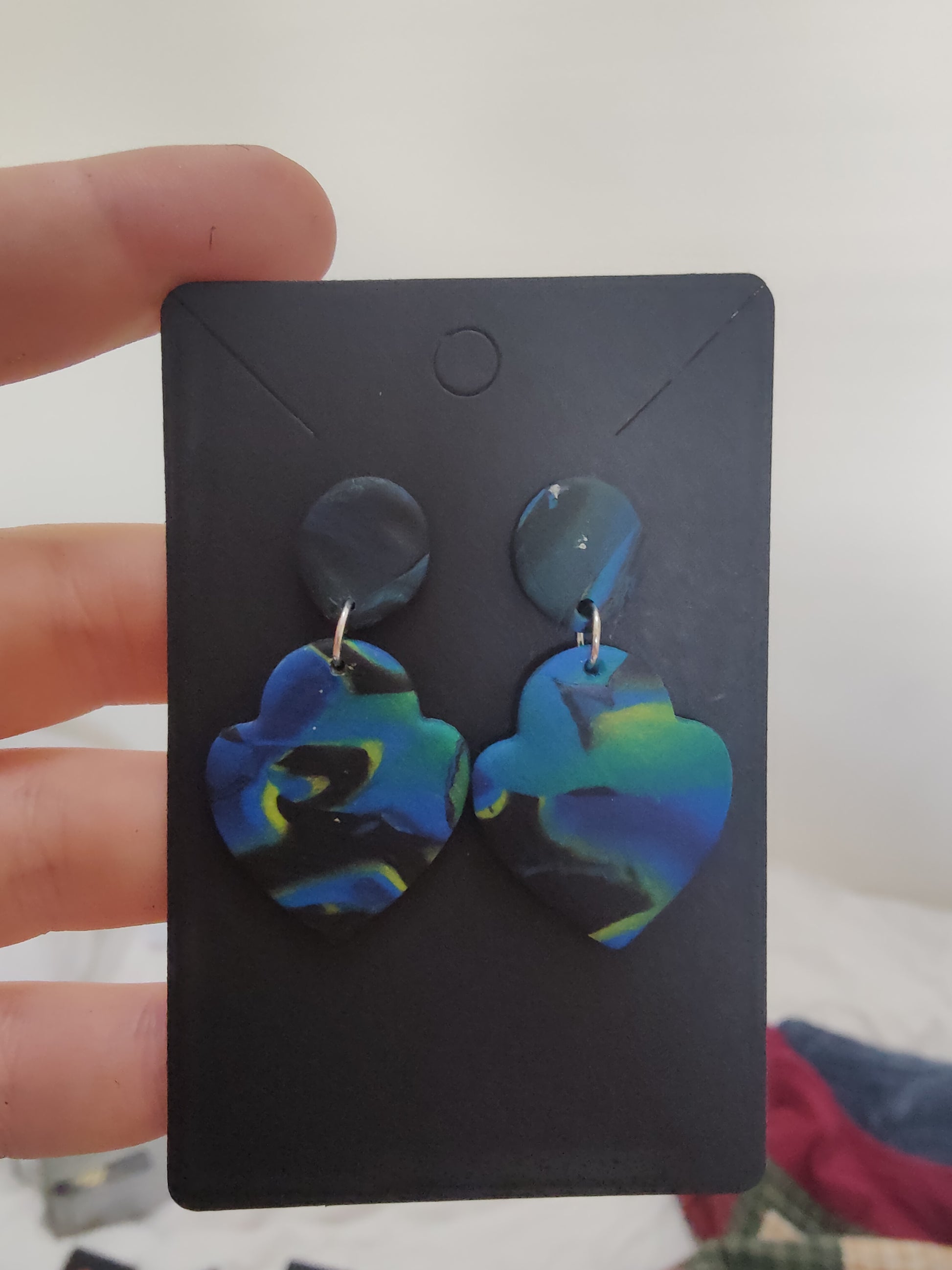 Make a bold statement with these dangle earrings, featuring a mesmerizing blend of deep blues, greens, and hints of yellow, reminiscent of the Northern Lights. Each earring is unique, giving you a one-of-a-kind piece. Perfect for those who love vibrant colors and artistic flair in their accessories.