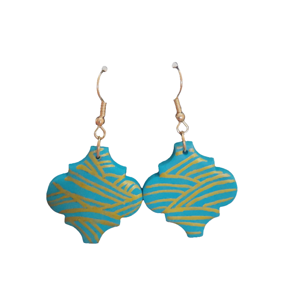 These stunning earrings capture the essence of Moroccan tilework with their intricate gold and turquoise design. The unique quatrefoil shape and the detailed line work add a touch of elegance and sophistication. Handcrafted with care, these earrings are both stylish and unique. As these are handmade, slight imperfections may be present, adding to their unique charm.