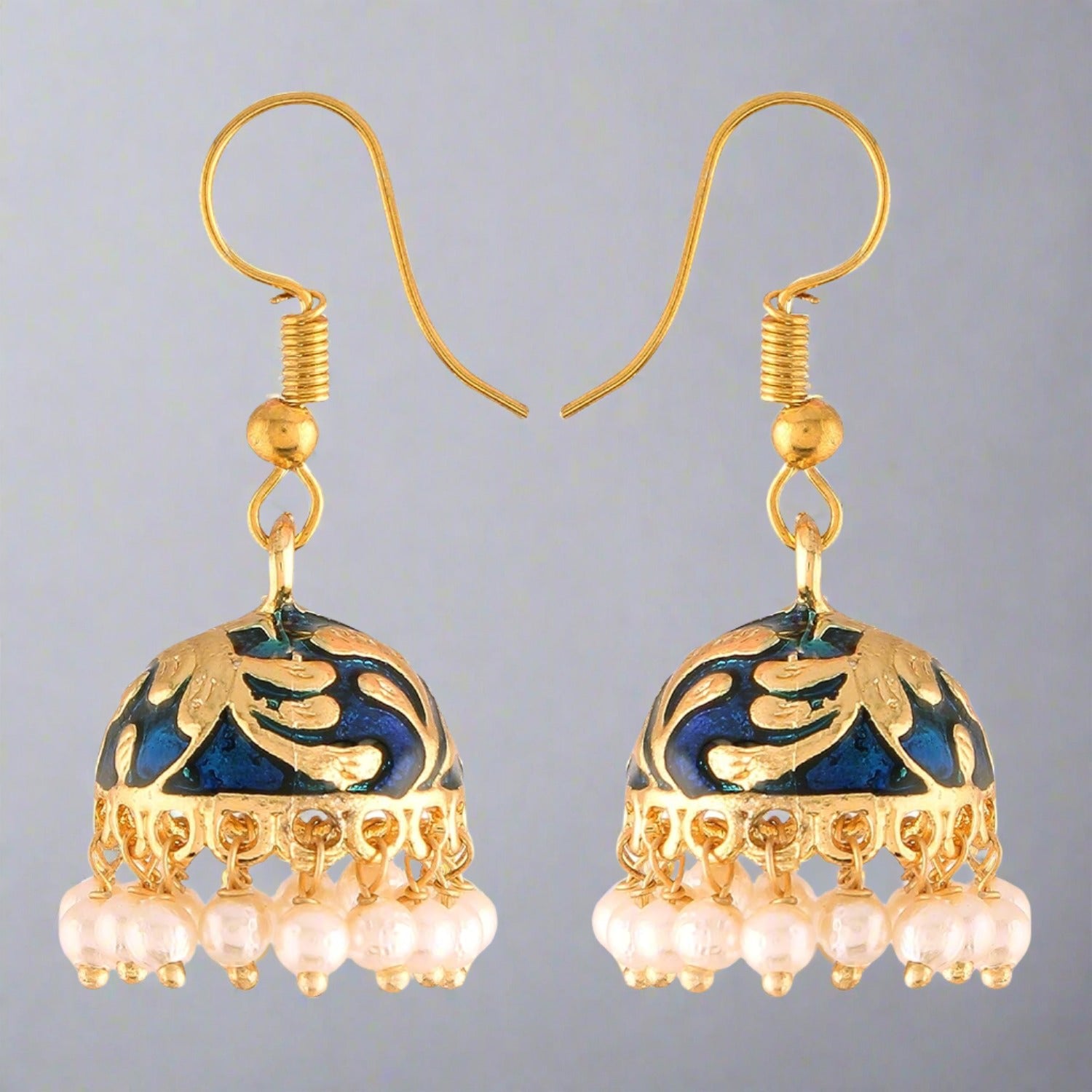 Look stylish and elegant with these Navy & Gold Jhumka earrings! Handcrafted with a timeless blue hue and shining pearls, these earrings will add a luxurious touch to any look. Why not make a statement and show off your timeless beauty?